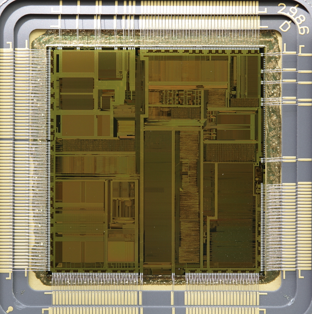 Closeup shows die with wire bonding. There appears to be lettering along the top edge of
