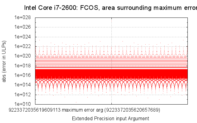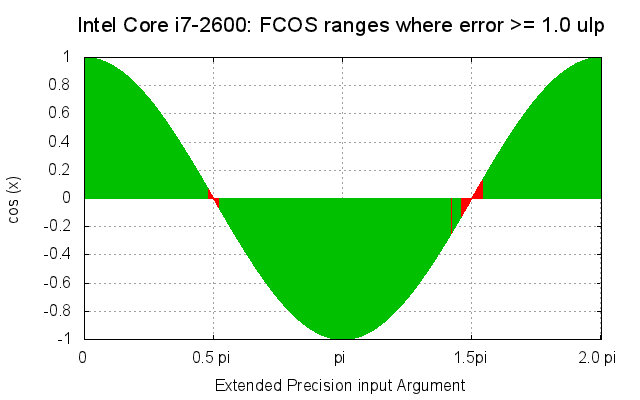 For nearly 20 years Intel has claimed high accuracy for the transcendental floating point instructions in its PC processor products. Intel documentation for the 1993 Pentium states: On the Pentium processor, the worst case error on functions is less than 1 ulp when rounding to the nearest-even and less than 1.5 ulps when rounding in other modes. This claim has never been true for the instructions fsin, fcos, fsincos, and fptan. The red in the plots below show ranges where the error exceeds 1.0 ulp. (see large versions).
